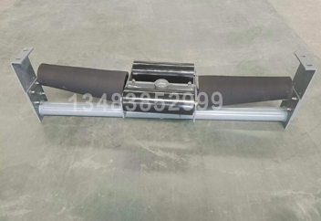 雙中輥調偏托輥組回轉軸焊在下橫梁上,回轉總成包括組合軸承、回轉軸套)安裝在下橫梁上,回轉總成外圍設計了可擺動的中托輥橫梁,以回轉軸為中心,在運行膠帶前、后中托輥橫梁各設置一個中托輥形成以回轉軸為中心的平衡支撐。側托輥采用加大軸承和軸徑設計,用側托輥軸代替常規(guī)的側托輥橫梁功能。側托輥可拆卸的安裝在兩中輥中間。側托輥為錐形輥設計,錐形輥采用鑄橡膠結構,其在膠帶跑偏時能產生較大的回向阻尼效果,從而使膠帶居中平穩(wěn)運行。